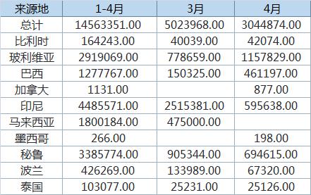 美國4月錫出口量為176,839千克,高于3月的129,563千克。