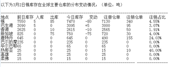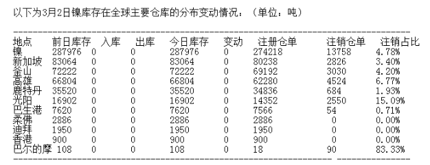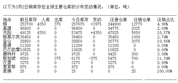 LME 3月2日有色金屬庫存分布情況