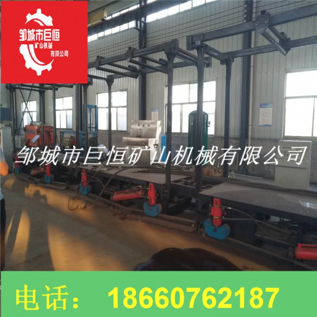 液壓自移式平板車上面安裝固定設備后,其首尾通過連接板順次連接,行走軌道通過中間段連