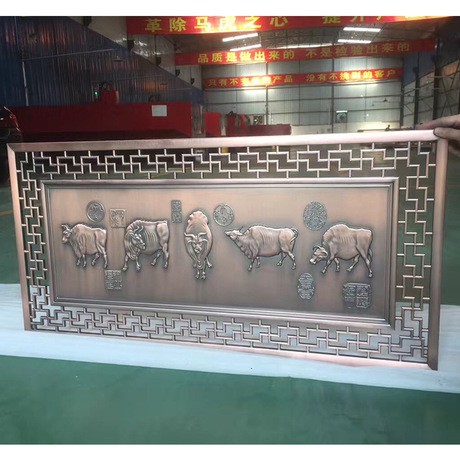 鋁板浮雕壁畫,鋁藝浮雕裝飾背景墻廣泛用在酒店大堂前臺背景墻裝飾,私人別墅客廳電視背景墻裝飾,KTV前臺背景墻裝飾等。氣勢宏偉高大,時尚大氣,是酒店、KTV大廳背景墻裝飾必不可少的物品。顏色有青古銅,紅古銅,黃銅,玫瑰金,香檳金,鈦金,K金等,若喜歡復古風格,可選古銅色,若要體現金碧輝煌則選擇香檳金和K金色