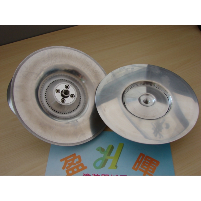 靜電高速噴漆霧化盤是圓盤型自動噴漆機器主要部件,承擔涂料霧化功能,涂層均勻及霧化顆粒大小省油有直接關連。旋碟霧化盤安裝在高速馬達連接端,涂料由泵浦定量輸送到盤內壁再經過高速離心旋轉往盤的底部小孔甩出形成霧狀微小顆。盈暉旋碟霧化盤材質為高密度鋁合金,表面特殊處理,光亮耐腐蝕,轉速可去到30000r/min,平衡好符合高速轉動要求。