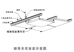 3、把預(yù)裝在三角龍骨的吊件連同三角龍骨緊貼輕鋼龍骨并與輕鋼成垂直方向扣在輕鋼龍骨下面,三角龍骨間距按板寬規(guī)格而定。全部裝完后必須調(diào)整至水平。