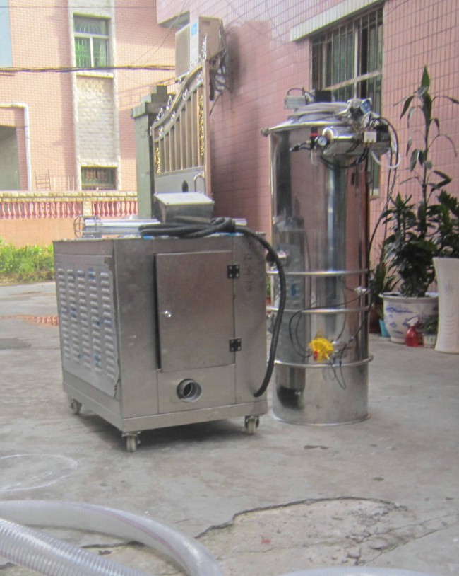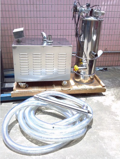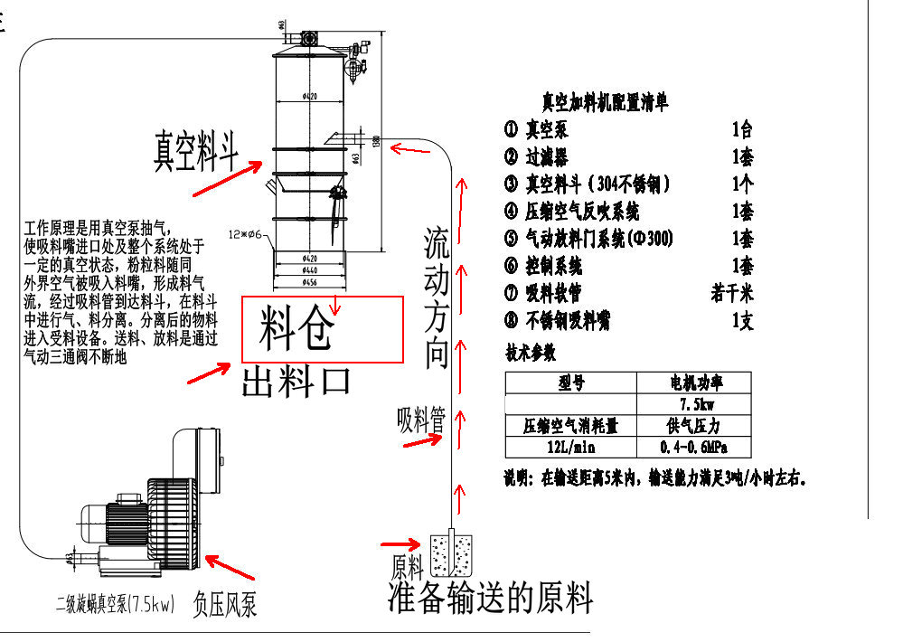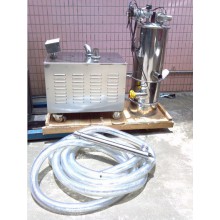 旋渦真空加料機是用真空泵抽氣,使吸料嘴進口處及整個系統處于一定的真空狀態,粉粒料隨同外界空氣被吸入料嘴,形成料氣流,經過吸料管到達料斗,在料斗中進行氣、料分離。分離后的物料進入受料設備。送料、放料是通過氣動三通閥不斷地開、閉來完成的,而氣動三通閥的開閉是由控制中心來控制的。真空加料機中裝有壓縮空氣反吹裝置,每次放料時,壓縮空氣脈沖反吹過濾器,把吸附于過濾器表面的粉末打落下來,以保證吸料能正常運行。 旋渦真空加料機由真空泵(無油、無水)或者羅茨風機、不銹鋼吸料嘴、輸送軟管、PE過濾器(或316L不銹鋼過濾器)、壓縮空氣反吹裝置、氣動放料門裝置、真空料斗和料位自動控制裝置等組成,整套系統設計合理、制造精美。 旋渦真空加料機是用旋渦氣泵抽氣,使吸料嘴進口處及整個系統處于一定的真空狀態,粉粒料隨同外界空氣被吸入料嘴,形成料氣流,經過吸料管到達料斗,在料斗中進行氣、料分離。分離后的物料進入受料設備。送料——放料是通過氣動三通閥不斷地開、閉來完成的,而氣動三通閥的開閉是由控制中心來控制的。 真空加料機中裝有壓縮空氣反吹裝置,每次放料時,壓縮空氣脈沖反吹過濾器,把吸附于過濾器表面的粉末打落下來,以保證吸料能正常運行。 該機是國內最為先進、理想、完善的粉狀料、粒狀料、粉粒料混合料的真空輸送設備。真空加料機能自動地將各種物料輸送到包裝機、注塑機、粉碎機等設備的料斗中,也能直接把混合的物料輸送到混合機(如V型混合機、二維混合機、三維混合機等)中,減輕了工人勞動強度,解決了加料時粉塵外溢等問題,是制藥廠、食品廠通過GMP認證、促進清潔、文明生產的首選設備。 旋渦真空加料機技術參數二. 型號 輸送量kg/h 電機功率 (KW) 耗氣量L/MINS 供氣壓力(Mpa) 料斗直徑(MM) 吸料口直徑(MM) 放料口直徑(MM) 料斗高度(MM) DZKs-1 400 1.5 8 0.4-0.6 ¢213 ¢38 ¢241 560 DZKs-2 600 2.2 8 0.4-0.6 ¢213 ¢38 ¢241 720 DZKs-3 1200 3 8 0.4-0.6 ¢290 ¢51 ¢325 850 DZKs-4 2000 5.5 8 0.4-0.6 ¢420 ¢51 ¢325 二、調試安裝 1、上料機的料斗一般固定在真空泵小車的立柱上,可上下移動,按受料設備的高度,調整好上料機料斗的位置。對受料設備(如包裝機)料斗較高時,需另做支架固定真空上料機的料斗。 2、用軟管把吸料嘴與料斗、料斗與真空泵連結好,并用喉箍卡緊。 3、接好電源。電源應采用三相五線制的電纜線,因為控制電路需要“工作0”,為了安全仍需要“保護0”,”保護0“的另一個作用是消除物料輸送時產生的靜電對控制芯片的干擾,造成控制系統死機。因此‘保護0”必須接上。 4、用 Φ 6壓縮空氣管插入系統進氣口(過濾減壓上),調整減壓閥,保證系統的壓力維持在0.6M pa,并按接管圖將小車上壓縮空氣接頭與真空料斗上氣缸的壓縮空氣接頭連接上。 5、接通電源,打開箱門,合上三相空氣開關,此時控制盒上上料時間、放料時間顯示器亮。 6、調整上料時間、放料時間。通過觸摸增、減按鈕將上料時間設定在10-30秒,將放料時間設定在4-8秒。 7、按下開/關按鈕,接通旋渦氣泵。檢查真空泵的轉向,若排風口無風排出,則電動機為反轉,關掉開/關按鈕,調換電源的接線相序,直至氣泵轉向正確為止。 8、按下開/關按鈕,啟動旋渦氣泵,將吸料嘴插入料箱中,隨即開始送料。吸料——放料(同時壓縮空氣反吹過濾器)為一個工作循環。真空加料機將自動循環下去,直至受料設備(如包裝機)料斗中的料加滿(此時料位開關亮)為止。 9、受料設備料斗中料位低于料位開關時,氣動三通閥自動換向,系統重新進入吸料-放料循環,直至料斗中的料加滿。 10、物料輸送過程,由于摩擦原因會產生較大的靜電,為了消除靜電,應考慮對設備外殼可靠接地。 11、真空加料機采用了新型微孔膜過濾器,大幅提高了機器的加料能力和使用壽命。微孔膜過濾器的合理清洗對真空加料機的使用性能致關重要。清洗微孔膜過濾棒時我們建議按以下步驟進行: 1)用壓縮空氣反吹過濾棒表面的粉塵。 2)用不超過80℃的熱水沖刷過濾棒的表面,或浸泡一定時間,用細毛刷刷凈過濾棒的表面,注意絕不能用硬毛刷刷凈過濾棒的表面,否則過濾棒表面將起毛,并且影響過濾棒的精度。 3)自然晾干或放在烘箱中烘干,烘箱溫度不能高于50℃。只有充分干燥后的過濾器才能被允許裝回機器上使用。 三、故障排除 如發現系統不上料,按以下程序檢查 1、電源相序接錯,真空泵反轉。 2、壓縮空氣管總截門沒打開,系統沒有壓縮空氣,氣動三通閥無法工作。 3、系統漏氣。 4、氣動三通閥的電磁換向閥失靈。 5、氣動三通閥的橡膠閥片破裂。 6、布袋堵塞嚴重須清洗或更換。 7、控制系統出現死機。關掉電源重新啟動即可。出現死機的原因是電腦芯片受到干擾,為了消除干擾應對設備外殼可靠接地。 3KW7.5KW 旋渦風泵7.5KW型號
