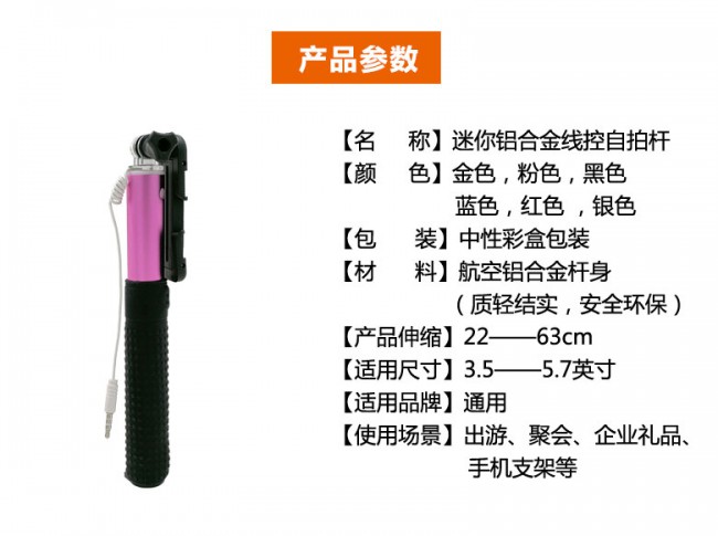 產品描述:60cm鋁合金自拍神器采用四節(jié)合金管,最大縮短長度僅有20CM,夾子精心設計可折疊,以致褲兜口袋都可攜帶,而且輕巧凈重僅僅有160g,航空鋁材質地輕,硬,安全,給您的手機最大程度的安全保障,拿在您的手中,完美、時尚又有檔次,是您和家人團聚,旅行,生活的最佳必備產品.