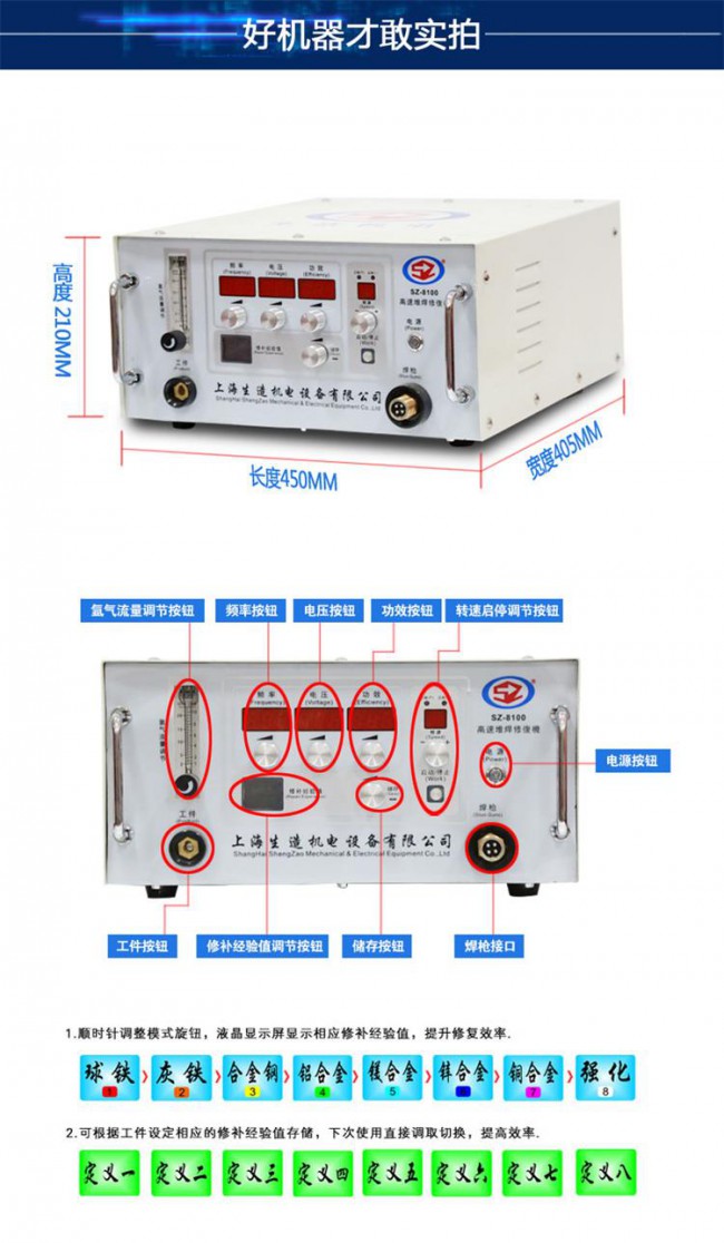 適用焊材:由于SZ-8100獨特的控制方式,輸出能量高,控制精確,所以焊材的適用性極廣。除常規的電火花堆焊專業焊材外,其他焊機所用的直徑在1.0-3.2mm的直條焊材多數適用,普通的電焊條去藥皮后也可使用。