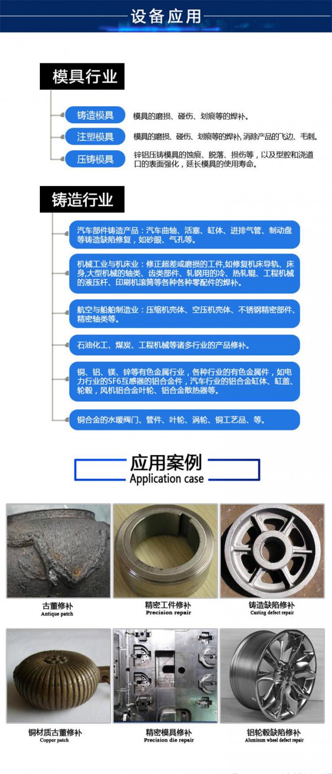 一機多用:可進行堆焊、表面強化等功能。可對黑色金屬(球鐵、灰鐵、不銹鋼等)、有色金屬(銅、鋁等)進行焊補。