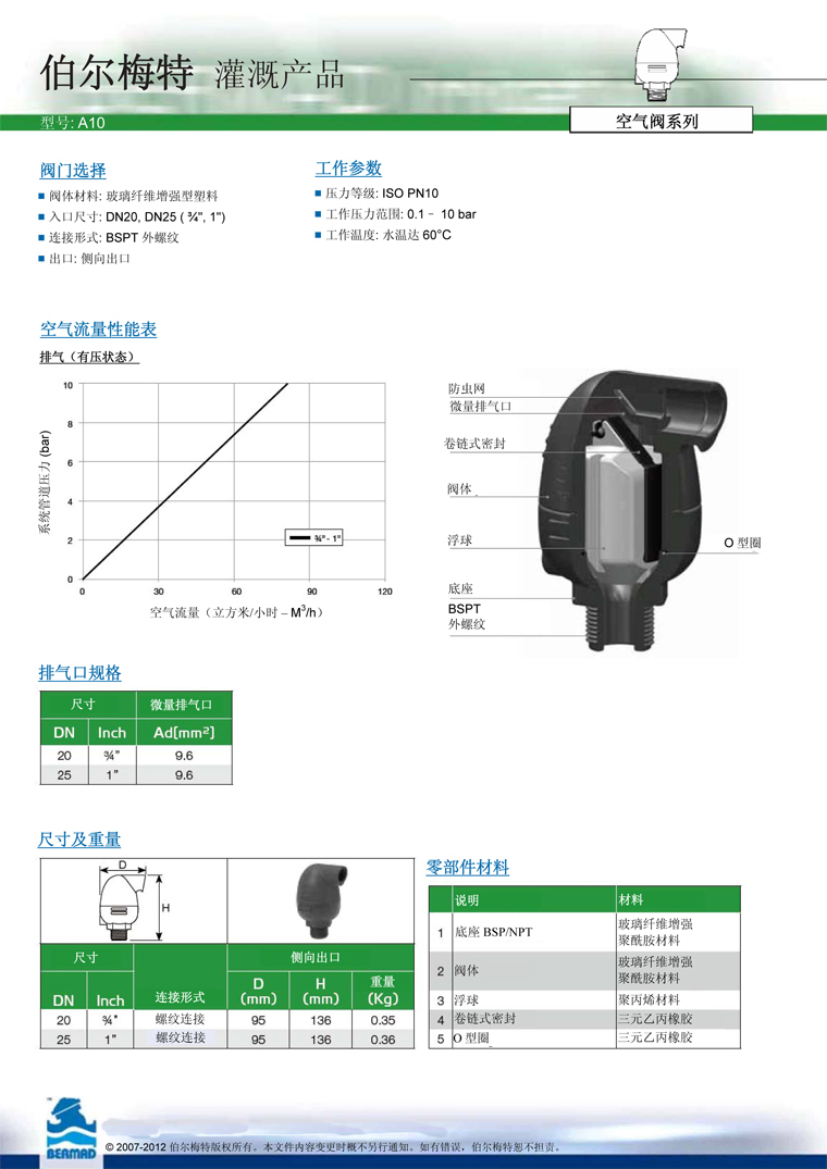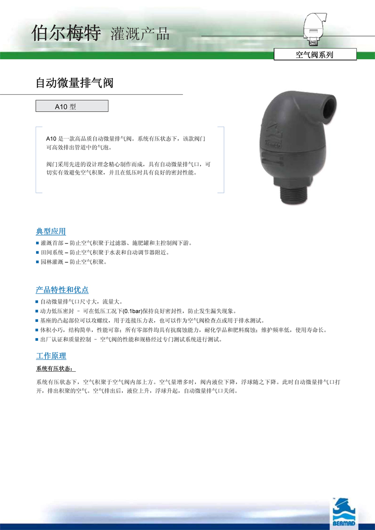 伯爾梅特A10自動微量排氣閥的產品特點:
