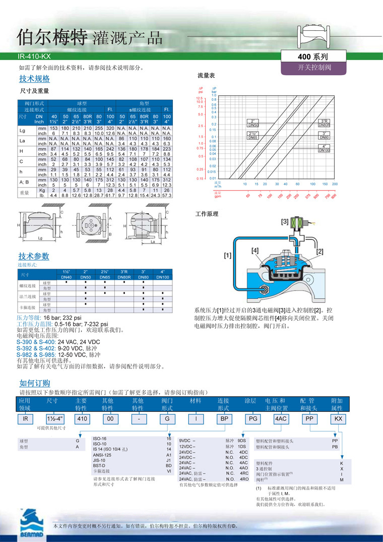 伯爾梅特 IR-400 型主閥是液壓驅動的隔膜式水力控制閥,其設計在控制閥業界處于領先水平。閥門結構簡單合理、性能出色、工作可靠性高,克服了其他單腔閥門的多種常見缺點。該系列自動水力控制閥能夠垂直或水平安裝,尺寸為2-16"; DN50- DN400。有多種材料和連接形式可供選擇。