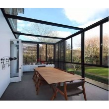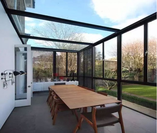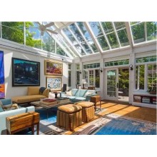 簡約風白色陽光房用全鋁的陽光房系統,骨架用幕墻斷橋鋁材料,頂用夾膠中空玻璃,四面用斷橋鋁門窗,良好的隔音設計和中空玻璃,有效阻止室內外熱量交替。內置PVB膠片鋼化夾膠玻璃,即使破碎,也不會對人體造成傷害,同時可吸收99.6\%紫外線。具有隔音、隔熱、通風、遮陽、防塵、防水等功能。