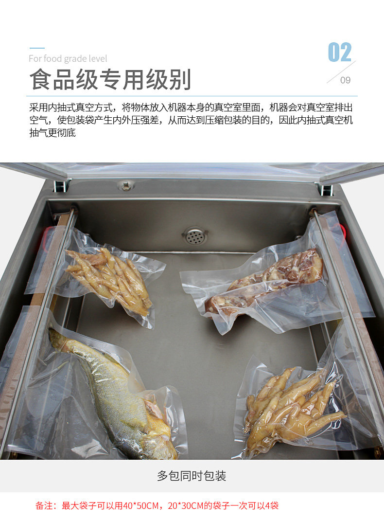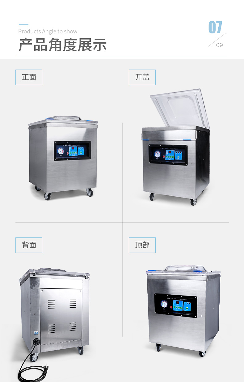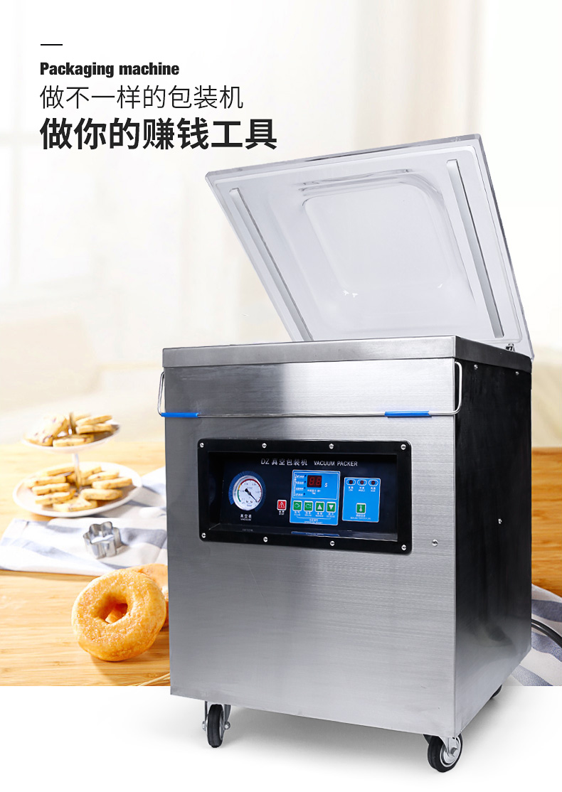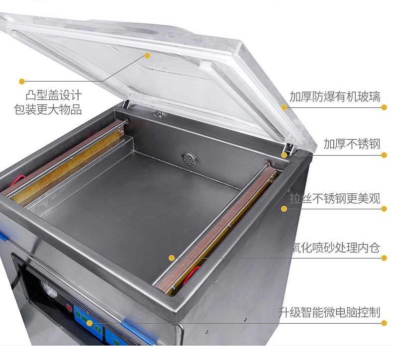 單室400真空包裝機為半自動真空設備,只需按下真空蓋即自動按程完成真空、封口、印字、冷卻、排氣的全過程。適用于各類食品、藥品、土特產、水產品、化工原料等各種固體、粉狀、糊狀、液體,電子產品(半導體、電路板、電子成品等)及機金屬加工件的真空包裝,以防潮、防氧化變色。經過包裝的產品可防止氧化,霉變、蟲蛀、受潮,可保質、保鮮延長產品儲存期限。