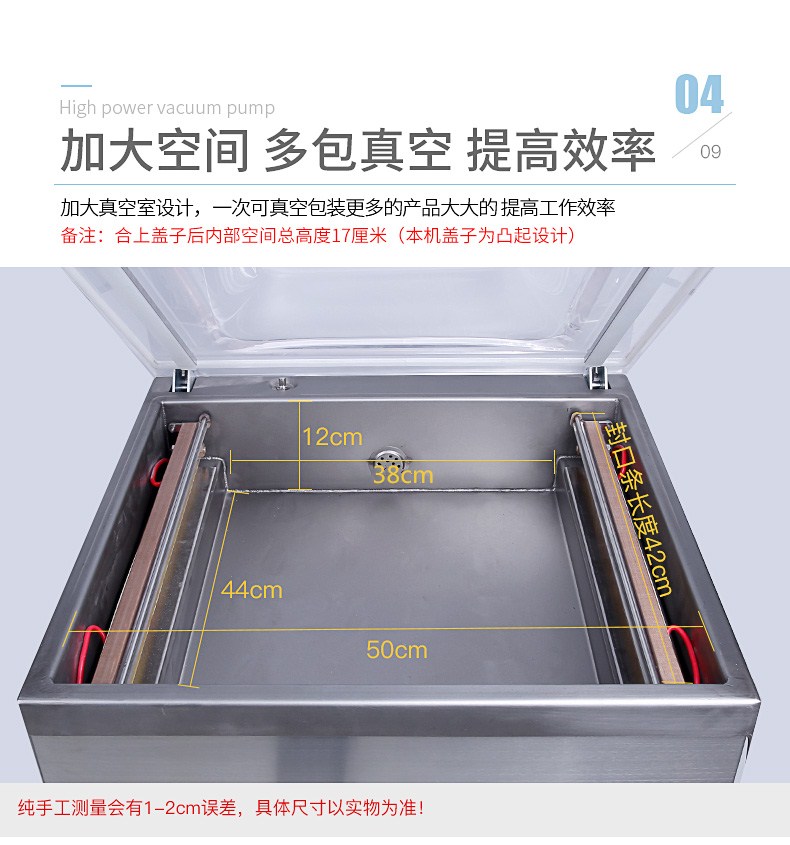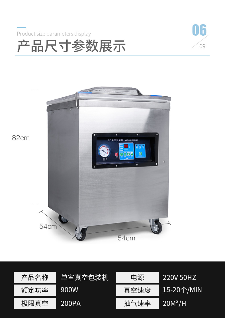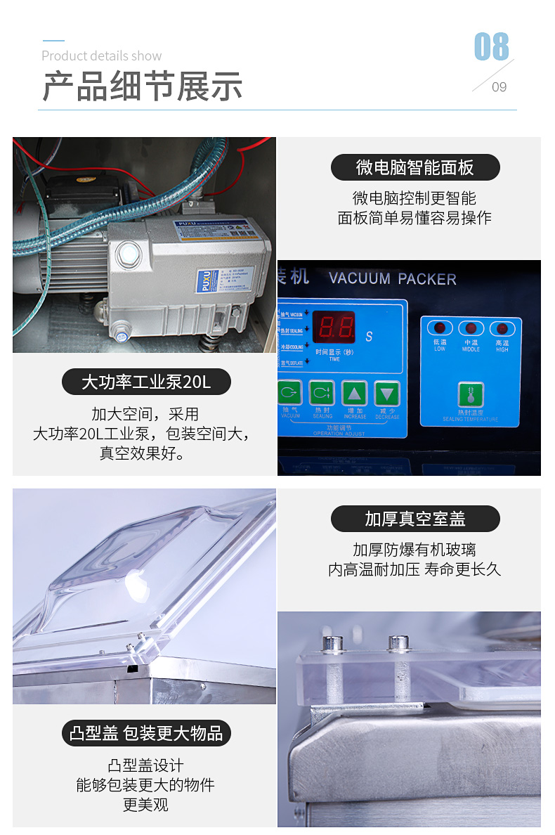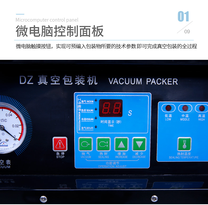 單室400真空包裝機為半自動真空設備,只需按下真空蓋即自動按程完成真空、封口、印字、冷卻、排氣的全過程。適用于各類食品、藥品、土特產、水產品、化工原料等各種固體、粉狀、糊狀、液體,電子產品(半導體、電路板、電子成品等)及機金屬加工件的真空包裝,以防潮、防氧化變色。經過包裝的產品可防止氧化,霉變、蟲蛀、受潮,可保質、保鮮延長產品儲存期限。