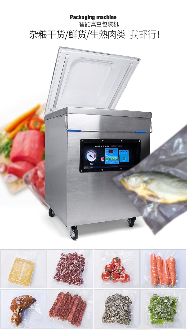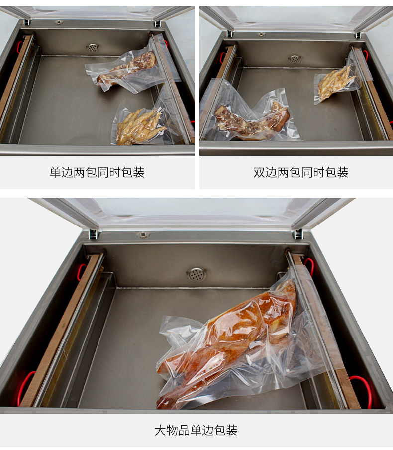 真空包裝機適用于食品行業可包裝火腿、肉類、魚干、雞鴨肉類、醬制品、調味品、果脯、糧食、豆制品、化學制品、藥材、農產品、電子、五金零件等商品進行真空后充惰性氣體包裝,經抽真空包裝后的物品可防止氧化、霉變、蟲蛀、受潮、延長產品儲存期限。
